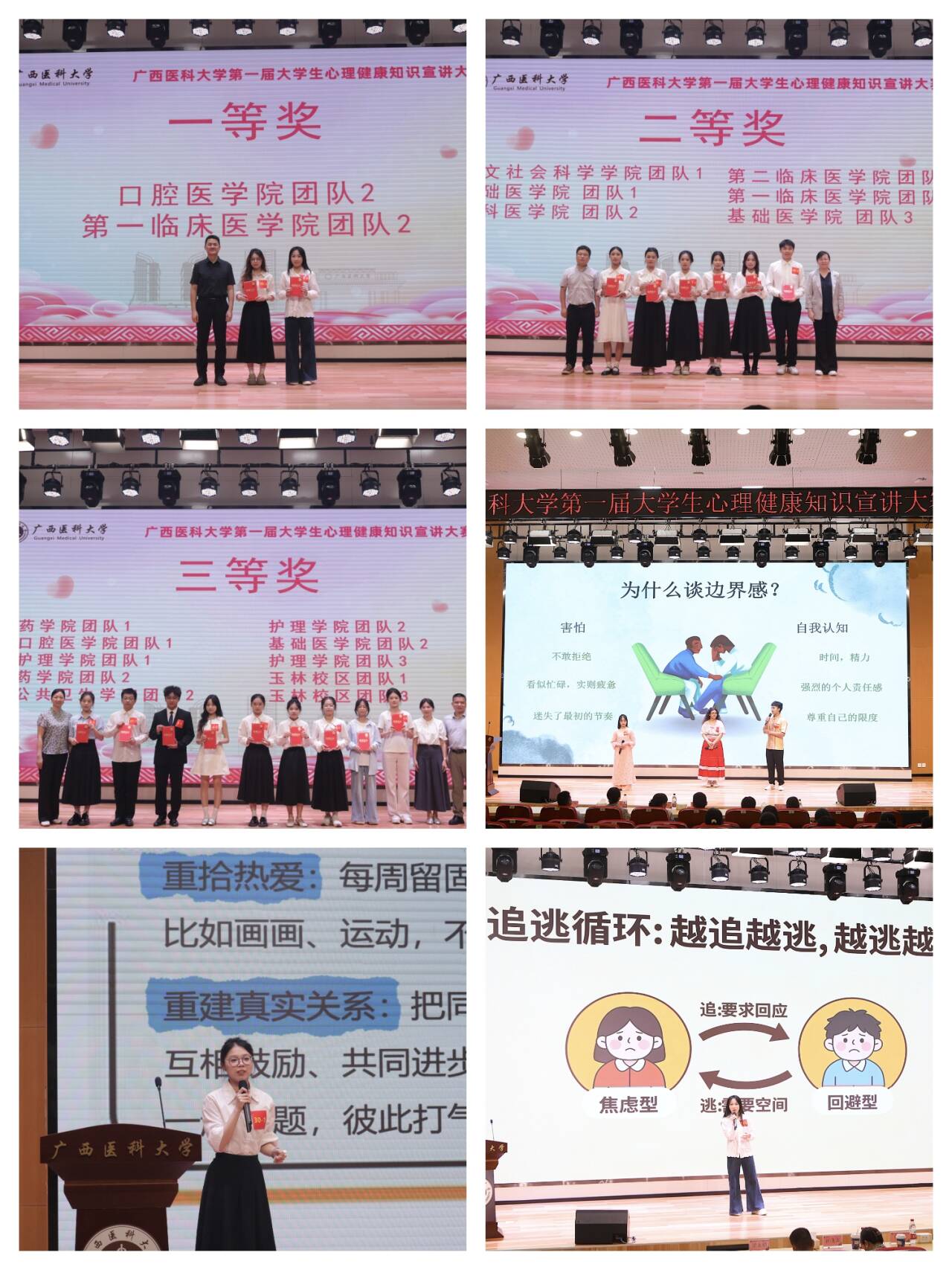 在上午的“珍爱生命 逐光而行”第一届心理健康知识宣讲大赛决赛中,35支队伍围绕情绪管理、人际交往、压力调适等主题展开精彩宣讲。覃雄在大赛致辞中表示,医学生拥有强大心理韧性与精湛医术同等重要,希望同学们“以赛促学,以讲传爱,协同联动”。经激烈角逐,口腔医学院团队2、第一临床医学院团队1荣获一等奖,另有6支队伍获二等奖、10支获三等奖、17支获优秀奖。